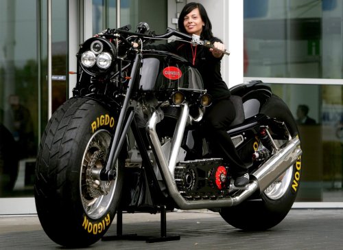 Германската манекенка Денис седи върху най-големия мотор в света, представен на мотоциклетното изложение Intermot в Кьолн. Моделът Gunbus 410 е дълъг 3.45 метра, има 6.7-кубиков V2-мотор, 350 конски сили и въртящ момент от 710 Nm. Максималната му скорост е 250 км/ч. Произведен е във фабриката Leonhardt, а цената му е 235 000 евро.