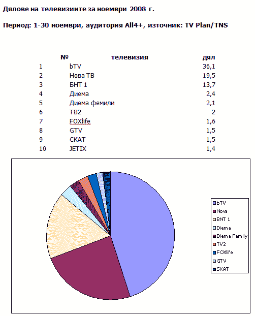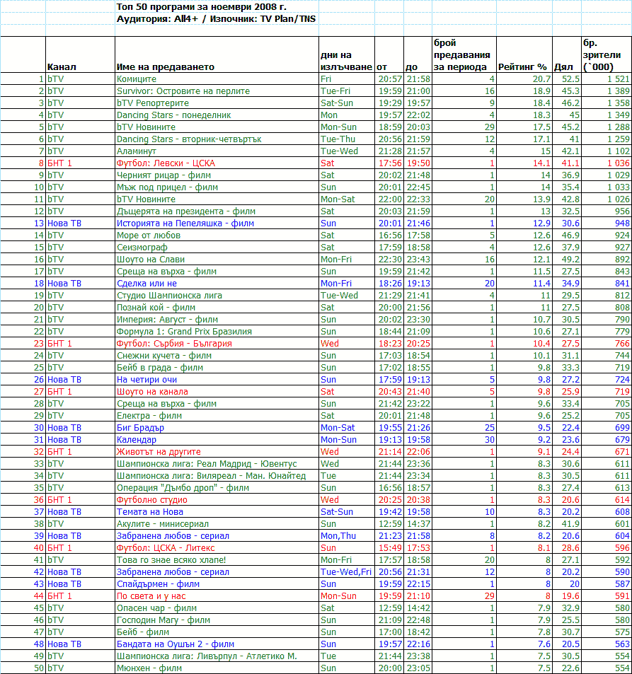 И този месец прави впечатление отсъствието на друга телевизия извън основните три в Топ 50. Нито английските мачове по „Диема“, нито „Шоуто на Азис“, „Градски легенди“ или „Истории с Патрашкова“ по TV2 не успяват да застрашат хегемонията на bTV, Нова и БНТ1.