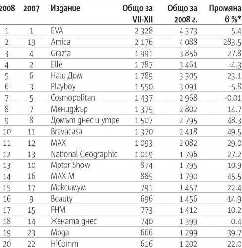 бизнес, публицистика, реклама Най-печелившите списания у нас през 2008-а Публикувано от author на 13.03.200905.11.2014 Maxim, MAX и FHM имат ръст в рекламните си приходи съответно с 45, 29 и 10 процента, сочат данните на „Капитал“. Playboy е единственото мъжко издание със спад – 5%. Изненадани? Сподели публикацията: Share on X(Отваря се в нов прозорец) X Share on Facebook(Отваря се в нов прозорец) Facebook Share on Pocket(Отваря се в нов прозорец) Pocket Email a link to a friend(Отваря се в нов прозорец) Имейл Харесвам Зареждане... Свързани