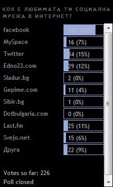 Фейсбук има огромна преднина като предпочитана социална мрежа – поне това показва анкетата сред посетителите на този сайт, в която се включиха над 220 души. Изоставането на MySpace (едва на пето място) e показателно за срива на този сайт, откакто конкуренцията му се появи преведена на български.