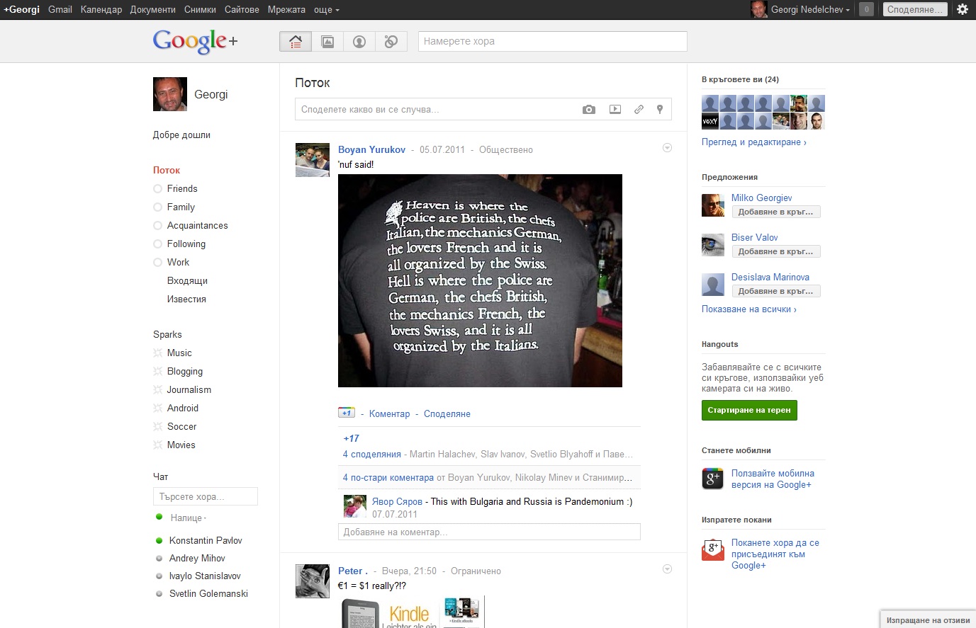 Атмосферата? Рано е да се прецени. На този етап – твърде много nerds, твърде много малцинства във всеки един смисъл на понятието. Обстановката е малко тип Twitter on steroids – всички, които сме там, сме много умни и над средното ниво, имаме особено мнение, склонни сме да хейтим. Всеки се чувства някак си длъжен да оригиналничи. Кефим се, че наоколо няма глупаци. Но дали така е по-добре? Без „глупаци“ нито една социална мрежа не може да има истински успех.
