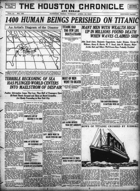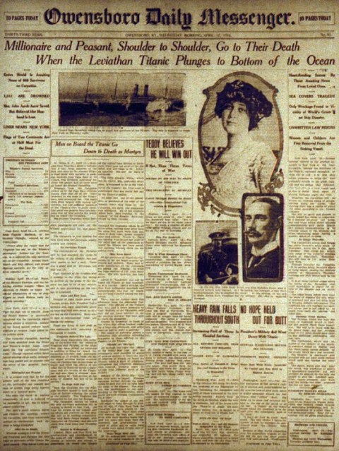 „Титаник“ потъна на 15 април 1912-а, 4 часа след сблъсъка си с айсберга. Ето някои първи страници на тогавашната преса. Междувременно този уикенд триизмерната версия на филма на Джеймс Камерън дебютира по кината при неочаквано голям интерес, особено в Китай. Там за пръв път в досегашната история на киноразпространението един холивудски филм печели по-голям касов сбор, отколкото в американската мрежа.