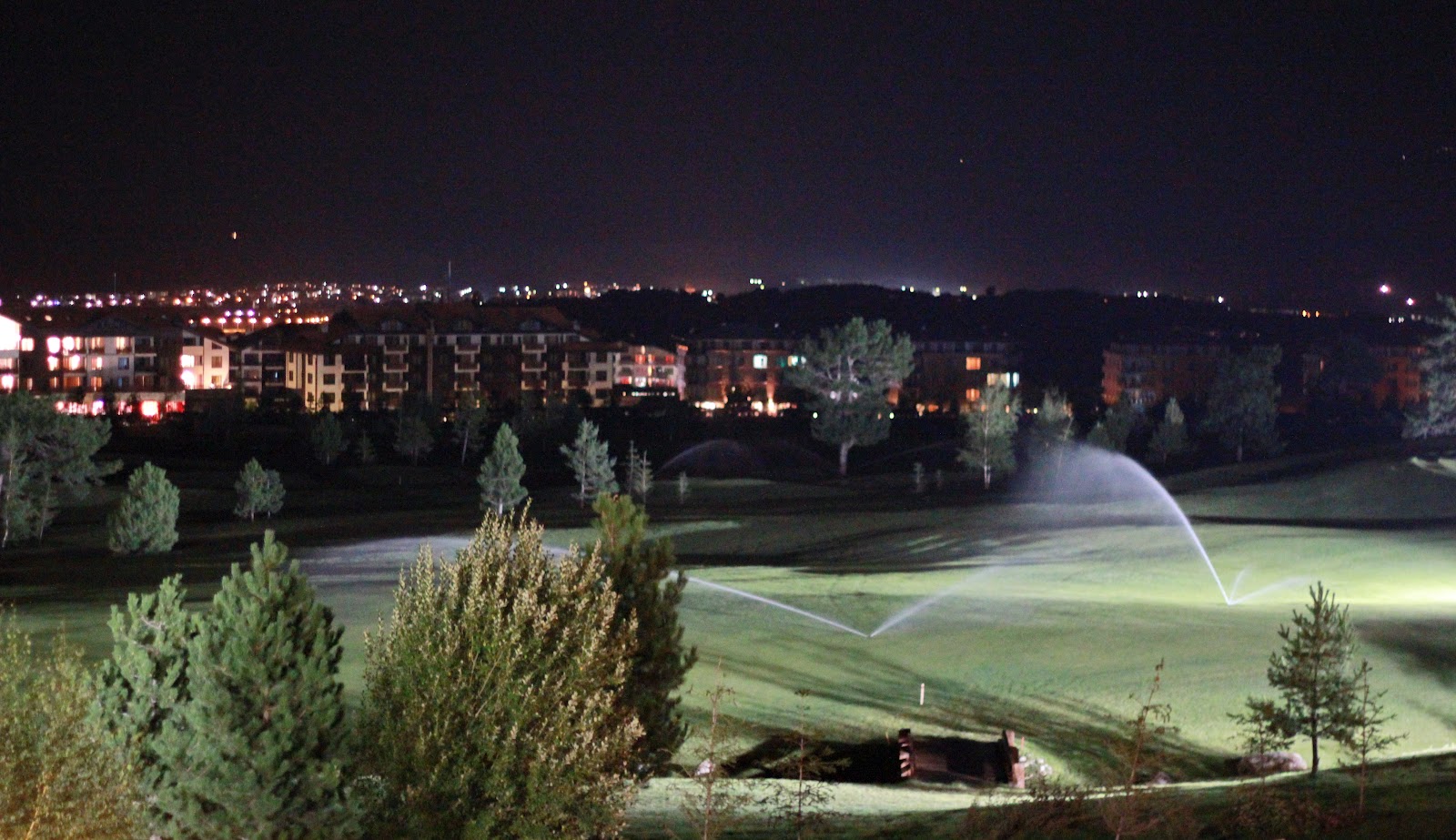 | Изглед от хотела малко преди полунощ. Чува се само звукът от пръскачките. В дъното се вижда Разлог. |