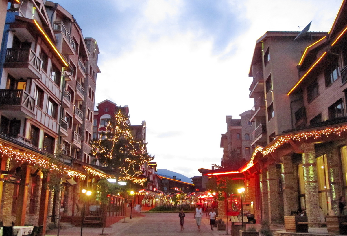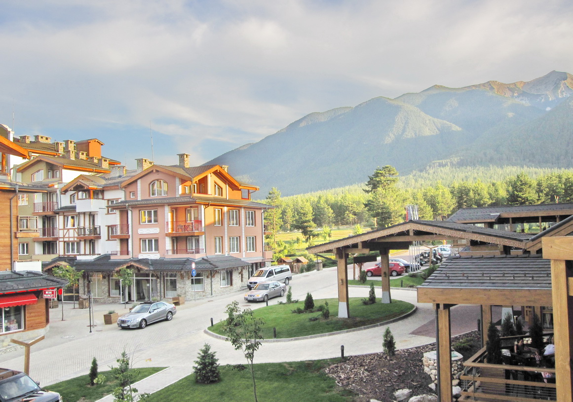 Тук всичко е предварително и внимателно обмислено – като се започне от сградите, които са хем в единен архитектурен стил, хем всяка различна и уникална, и се завърши с малките дървени „къщички“, с които е опакован всеки контейнер и абсолютно всяко кошче за боклук. Гордостта в центъра на комплекса е фонтанът – такъв, какъвто трудно ще видите в България и по света. От едната страна фон зад него е връх Вихрен, от другата – петзвездният хотел, от третата – голямото голф-игрище, а на изток – едно от изкуствените езера.