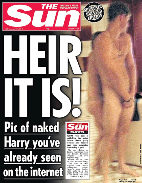 Денонощие по-късно обаче най-четеният вестник – “Сън” от империята на Рупърт Мърдок, дръзко пусна снимките, на които принцът играе “стрийп-билярд” с неизвестна американска девойка. Предишния ден таблоидът бе приложил хитрост на първата си страница, разигравайки инсценировка на забранените голи кадри – с участието на свой редактор и млада стажантка, специално съблечени в същите пози.