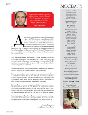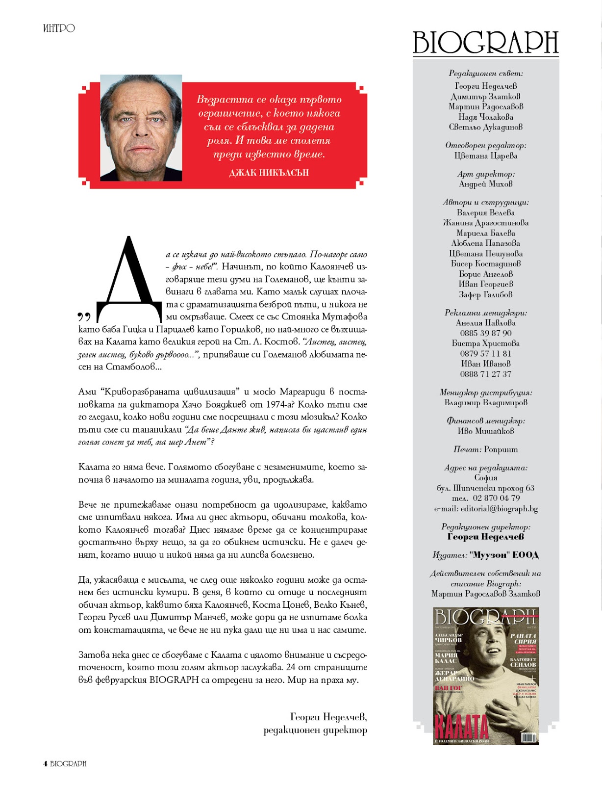 Затова нека днес се сбогуваме с Калата с цялото внимание и съсредоточеност, която този голям актьор заслужава. 24 от страниците във февруарския BIOGRAPH са отредени за него. Мир на праха му.
