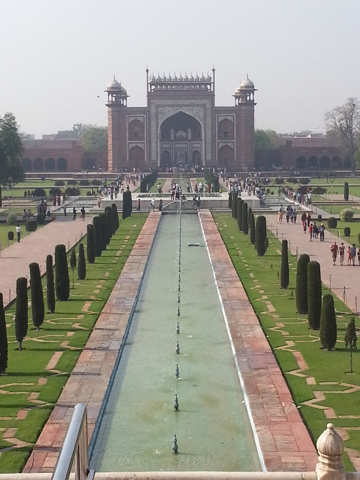 | Поглед от входа на Тадж Махал към централната порта, водеща към него. |
