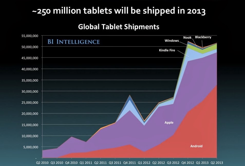 Забележете и какво се случва с пазарните позиции на марката, която допреди няколко години почти еднолично олицетворяваше идеята „смартфон“ – BlackBerry. За отбелязване е видимото стабилизиране в пазарното присъствие на Windows-платформите при таблетите. Там обаче хегемонията на Android изглежда все по-неудържима, а спадът в ръста на продажбите на iPad е нечуван и немислим доскоро.