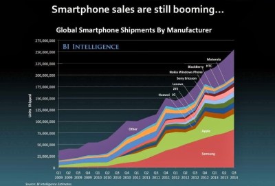 Две графики за размисъл на всички онези, които продължават да твърдят, че Apple не е в криза. Първата показва продажбите на смартфони по тримесечия, а втората – продажбата на таблети. И при двете се вижда че Apple, макар и запазвайки относително голям дял, бележи наполовина по-малък ръст, отколкото е ръстът на целия сектор. Това според повечето анализатори е критичен проблем, особено за големите пазари извън САЩ, където неоправдано високите цени на устройствата карат все повече потребители да се пренасочват към конкурентни платформи и марки. В по-далечно бъдеще тази промяна в клиентската нагласа може да се окаже фатална за Apple.