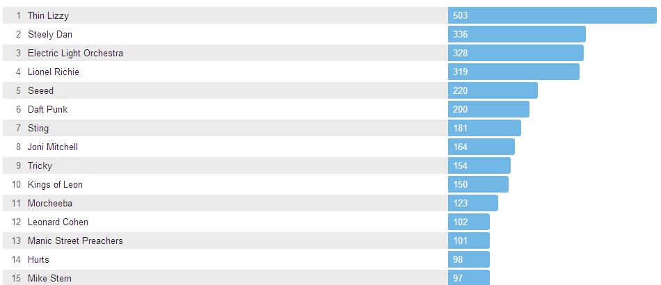 Още сме на вълна годишни обзори. Това е списъкът на изпълнителите, които съм слушал най-много през 2013-а – вкъщи и на слушалки от телефона си. За моя изненада, на първо място се оказа една стара рок-група – Thin Lizzy, може би защото наистина е много подходяща да звучи в ушите ти, докато вървиш. И, да, такива гении като Фил Линът (1949-1986) не се раждат всяка година.