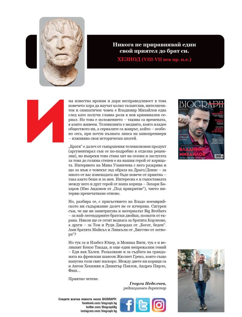 „Братя“ е далеч от съвършения телевизионен продукт (аргументирал съм се по-подробно в отделна рецензия), но въпреки това стана хит на сезона, и заслугата за това до голяма степен е на нашия герой от корицата. Интервюто на Мина Узаничева с него разкрива и що за мъж е човекът зад образа на Драго/Денис – за много от вас изненадата ще бъде повече от приятна – така, както беше и за мен. Интересна е и съпоставката между него и друг герой от наша корица – Захари Бахаров (Иво Андонов от „Под прикритие“) – чието интервю препечатваме отново.