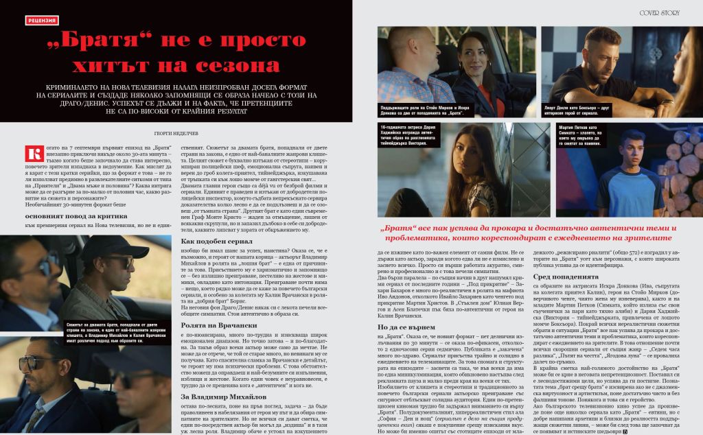 Как подобен сериал изобщо би имал шанс за успех, наистина? Оказа се, че е възможно, и героят от нашата корица – актьорът Владимир Михайлов в ролята на „лошия брат“ – е една от причините за това. Присъствието му е харизматично и запомнящо се – без излишно преиграване, пестеливо на жестове и мимики, овладяно като интонация. Преиграване почти няма – нещо, което рядко може да се каже за повечето български сериали, и особено за колегата му Калин Врачански в ролята на „добрия брат“ Борис. На неговия фон Драго/Денис някак си с лекота печели всеобщите симпатии. Стои автентично в образа си.