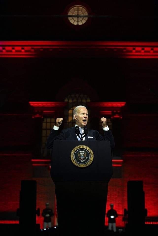 „Тръмп и неговите MAGA републиканци представляват екстремизъм, който заплашва устоите на нашата република“, патетично заяви Байдън пред сградата, в която са подписани Декларацията за независимостта и конституцията на САЩ.