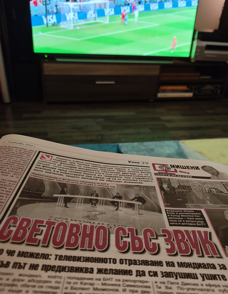 Първото, и дано последно, световно първенство, което гледаме при нулеви температури навън, е телевизионен феномен по няколко причини. През лятото бяхме свикнали да следим мондиалите навсякъде другаде, но не и вкъщи – основно по заведения или в още по-масови събирания на фенове пред големи екрани из градовете. Там студийните анализи, а и коментарите зад кадър, не са от толкова съществено значение, защото малцина им обръщат внимание.