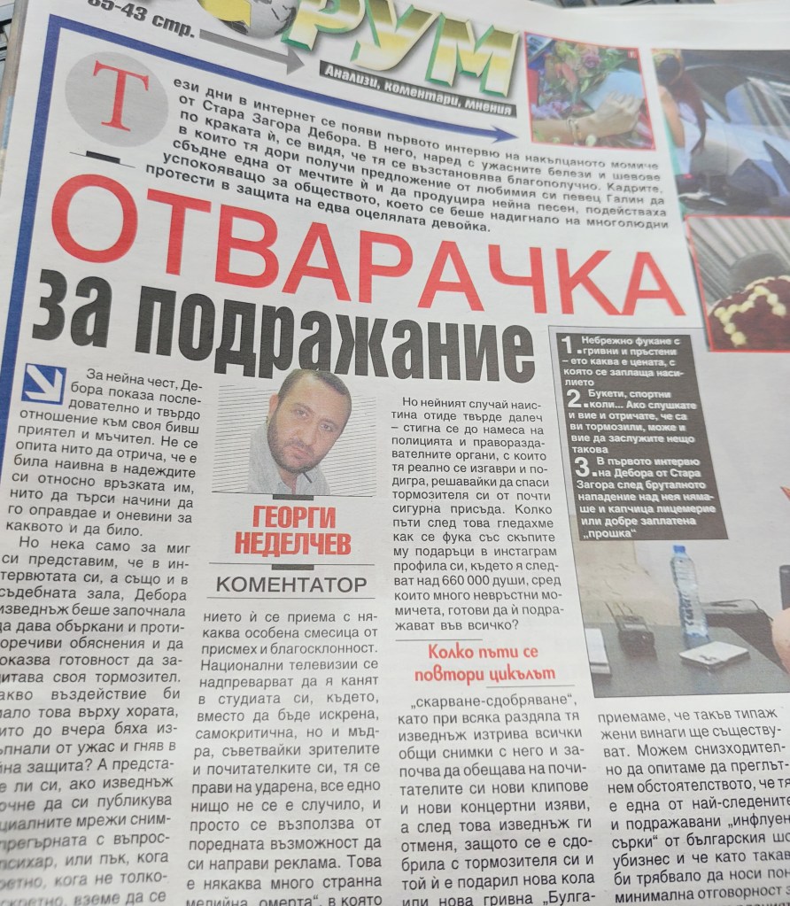 Както винаги- право в десетката, господин Неделчев. Поредната Ваша статия, от която доста Ваши „колеги“ следва поне да се изчервят. Не знам дали сте в течение конкретно относно момичето от Стара Загора. Един чутовен и печално известнен сайт написа безумни неща наистина. Внушението беше от гнусно нататък. Че това с макетния нож си били НОРМАЛНИ практики за „дисциплиниране“ между…сводник и подчинена!? Нарекоха я проститутка с две думи. О, и много ги вълнуваше как така около месец по- късно носът на момичето изглежда перфектно. Как така за един месец? Симулира един вид, лъже. Такива едни внушения и манипулации. Колкото до Отварачката. Тя е доволно елементарен биологичен сбор от клетки. Тя това си може. Ниво чехълче. Което не е оправдание за малоумното й поведение. Погледнах инстаграма й- тя вЕрно се има за най- най- най. Мен доста повече ме притесняват някои други неща. Например казусът с Диана Димитрова и Вергов. Там истината така и не стана ясна. Въобще. От някъде се „намери“ старо интервю на Вергов, в което той „казал“, че „всяка жена си мечтае тайно за по- властно отношение. Някои дори обичат да ги удрят“. Димитрова наводни ефира със себе си, но аз като лекар и като човек, преживял домашно насилие в рамките на точно едно десетилетие в крехка детска възраст, имам доста съмнения. Ако се е случило, както казва тя- защо е мълчала пет години? Никой човек, който се интересува от достойнството си и истината- както каза тя- не чака пет години, за да се защити! Аз нямаше какво да направя на моите 15 в комунистическа България, където домашно насилие „нямаше“. Затова просто избягах. Щом можах. Избягах. Това можах, това направих. В първия възможен момент. Пет години. Това е много време. Тя сама призна, че е избрала да не съсипе кариерата си. Може да Ви се стори грубо и бездушно, но ми е трудно да съчувствам на човек, който се сеща пет години по- късно, че има достойнство. Трудно ми е да вярвам на такъв човек. Снимките, които тя публикува, така и не преминаха независима експертиза. Ето такива случаи ме тревожат много повече. Димитрова е много по- вредна като поведение от Отварачката. А това не е единичен случай. Такива жени правят най- лошото- рушат доверие. И се стига до там да не вярваме на истинските жертви. Защото някоя прехвалена глезла се сетила да напомни за себе си по такъв начин. Като една от анонимните идиотки в Щатите, обвинила в тормоз Пласидо Доминго. Преди 40(!?!!!) години й казал пред други хора, че е изключително красива и й целунал ръка. Това я накарало да изпита „неописуемо емоционално страдание“ поради…нарушение на личната неприкосновеност!? Почувствала се „изложена на показ и сексуално обективизирана“?!!!! И са й трябвали 40 години да го осъзнае. Ти да видиш. Каква мъка, какъв ужас. По повод тези обвинения в интервю Райна Кабаиванска заяви: „Странно. Бях млада и доста хубава. Работила съм с него дълги години. Пък не ми е посягал. Дали да не му се обидя за това? Виждала съм обаче доста дами доста агресивно да претендират за вниманието му.“ Какво повече да каже човек!? Пък и да кажеш нещо- не е ясно какво ще се случи! Само преди няколко месеца в един салон за красота управителката се възмути от мен шумно и на глас, казвайки, че съм „токсично хетеросексуална“?!! Защото…дискретно и тихо попитах може ли лечебният масаж, за който съм при тях да бъде направен от мъж- 