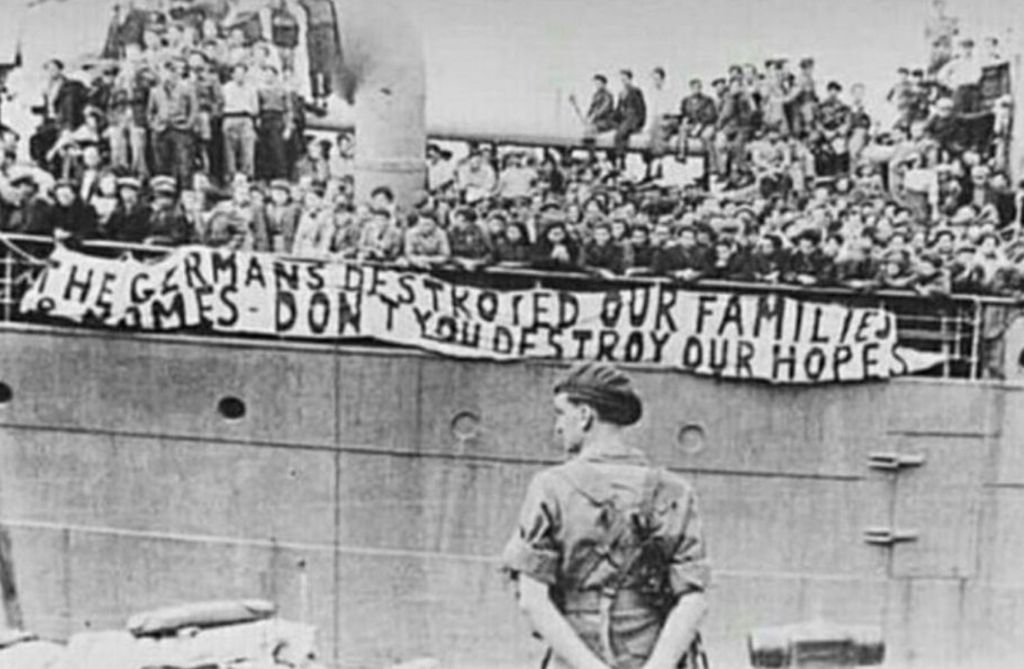 Кораб с еврейски бежанци пристига в Палестина през 40-те години с надпис: „Немците унищожиха семействата и домовете ни – вие не убивайте последната ни надежда!“