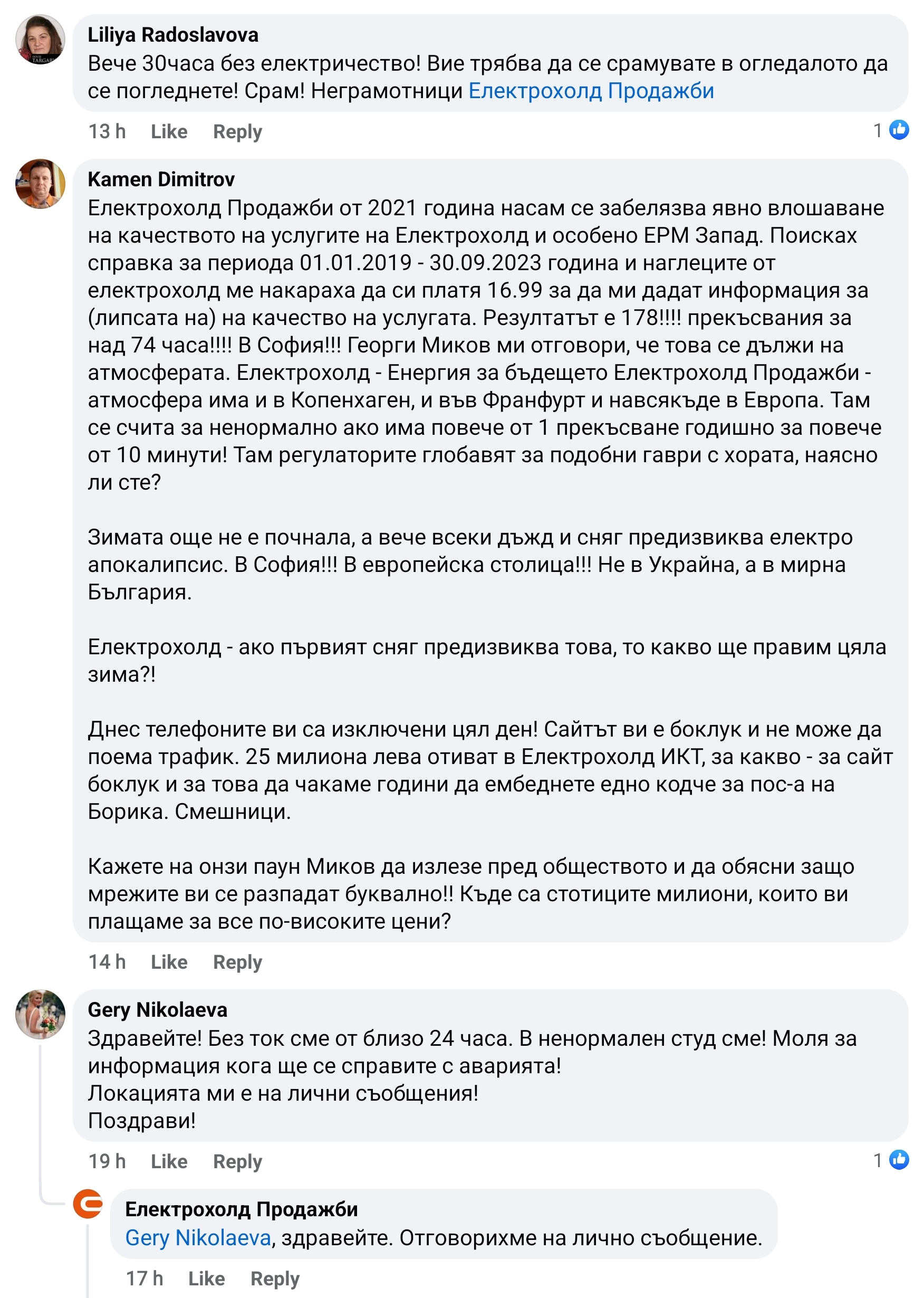 Любителите на конспиративните теории побързаха да заподозрат „Електрото“, че авариите всъщност са зле прикрито въвеждане на режим на тока поради недостиг на мощности. Иначе би било логично все някъде да беше изброено къде точно кои екипи работят по ремонтите. Можеше дори евентуално да има снимки, а часовете на приключване да се спазваха поне приблизително и без неколкократно преместване. Вместо това в сайта на „Електрохолд продажби“ се мъдреха само някакви стари реклами, а хората изливаха яростта си в коментарите под тях…