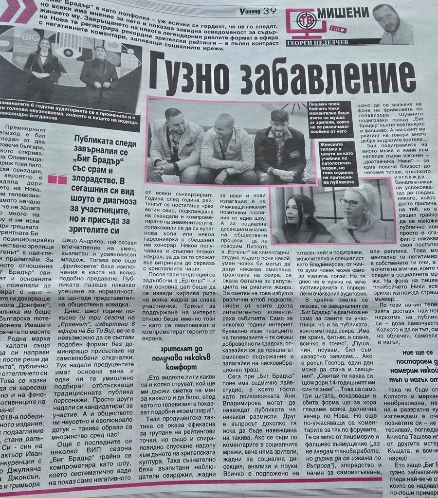 „Биг Брадър“ е като поп-фолка – уж всички се гордеят, че не го следят, но всеки има мнение за него и показва завидна осведоменост за съдържанието му. Завръщането на някога легендарния риалити формат в ефира на Нова тв регистрира рекордни зрителски рейтинги – в пълен контраст с негативните коментари, заливащи социалните мрежи.