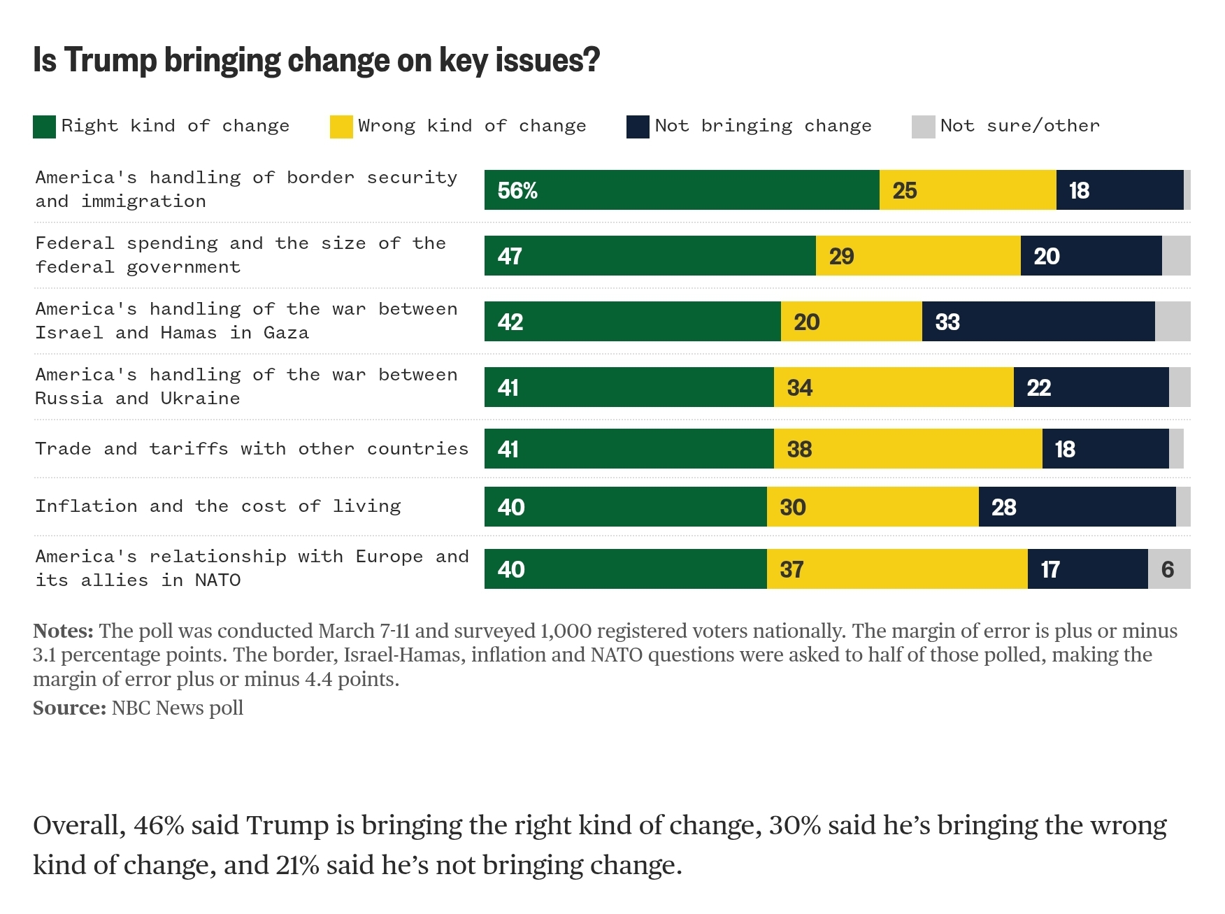 От друга страна, да го приемаш „насериозно“ означава да гледаш отвъд думите -към емоцията и по-широкия сигнал, който той изпраща. За поддръжниците му стената не беше просто бетонна конструкция, а символ на контрол над границите и защита на американските интереси – нещо, което те приемаха сериозно, независимо дали Мексико реално ще я плати или някой друг. Впрочем, откакто Тръмп отново е на власт, нелегалната имиграция е намаляла с рекордните 95% – от 1500 души средно на ден до не повече от 30-ина.