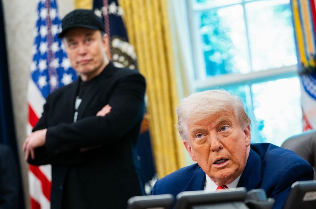 30 май 2025: тук все още са съюзници. Илон Мъск, който дори притежава символичен ключ за Белия дом, стои зад рамото на президента по време на пресконференция в Овалния кабинет.