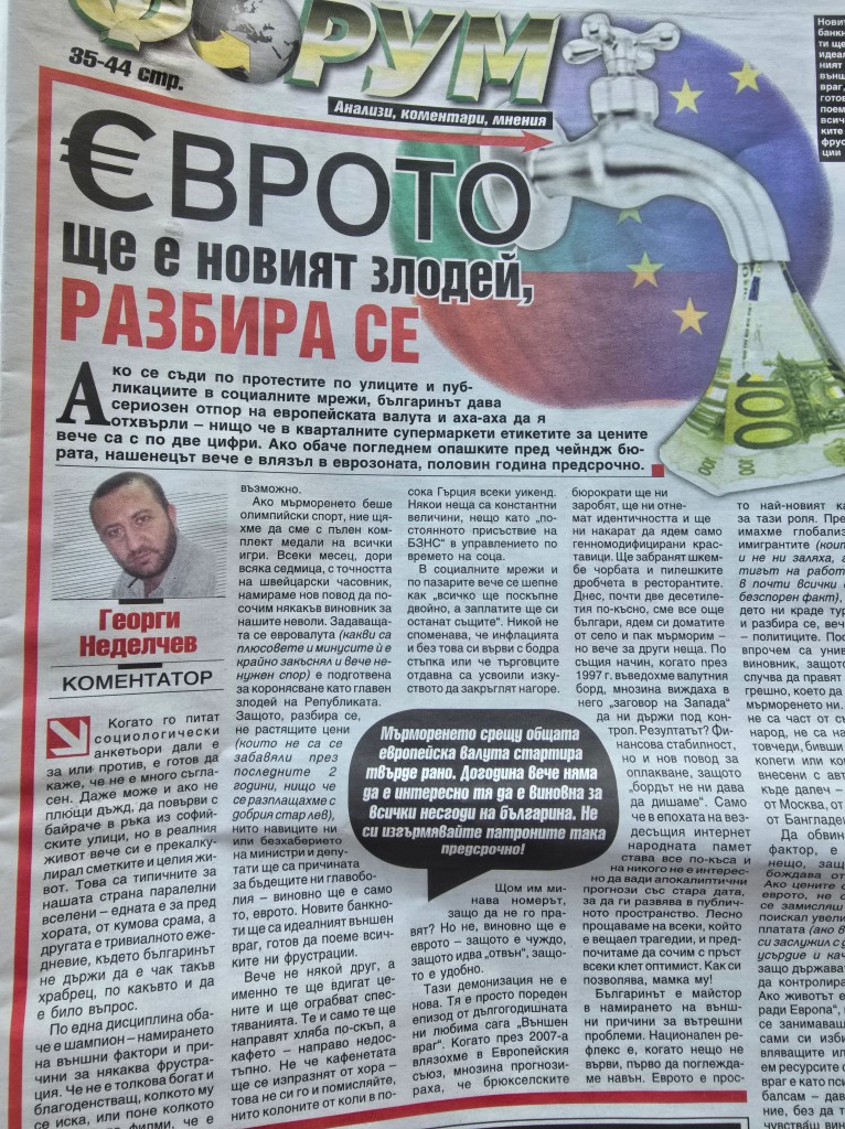 Ако мърморенето беше олимпийски спорт, ние щяхме да сме с пълен комплект медали на всички игри. Всеки месец, дори всяка седмица, с точността на швейцарски часовник, намираме нов повод да посочим някакъв виновник за нашите неволи. Задаващата се евровалута (какви са плюсовете и минусите й е крайно закъснял и вече ненужен спор) е подготвена за коронясване като главен злодей на републиката. Защото, разбира се, не растящите цени (които не са се забавяли през последните две години, нищо, че се разплащахме с добрия стар лев), нито навиците ни или безхаберието на министри и депутати ще са причината за бъдещите ни главоболия – виновно ще е само то, еврото. Новите банкноти ще са идеалният външен враг, готов да поеме всичките ни фрустрации.