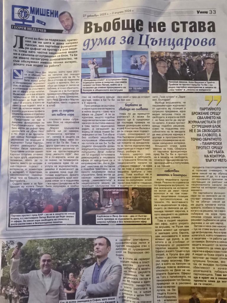Това е същият национален ефир, който упорито ни внушава, че Русия хем всеки момент ще нападне и завладее цяла Европа, хем икономиката й всеки момент ще рухне, а ракетите й се сглобяват от откраднати от украински перални машини чипове. Ефирът, в който Тръмп е луд злодей, а Урсула фон дер Лайен – достоен европейски лидер-визионер. Ефирът, в който на Хелоуин се обръща повече внимание, отколкото на Деня на народните будители. Ефирът на Гого с папийонката, на пенсионирания топ-банкер, превърнал се в рекламно лице на евровалутата, на Летящата Козила Белобрадова, на вталения Иво Мирчев и на не толкова вталения Асен Василев…