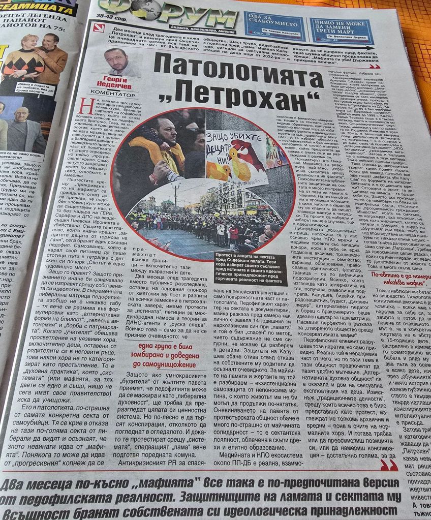 Протестите срещу „прикриването на мафията“ са принципен отказ да се признае, че подобен зловещ култ може да съществува у нас, и то без чадъра на ГЕРБ, Сарафов и ДПС на вездесъщия Пеевски. Иронията е убийствена. Същите тези гласове, които иначе крещят „защитете децата от тормоза на Ганя“, сега бранят един доказан педофил. Самозванец, който е карал свой питомец да пише стотици пъти в тетрадка с детския си почерк „Светът е едно чудовищно място“.
